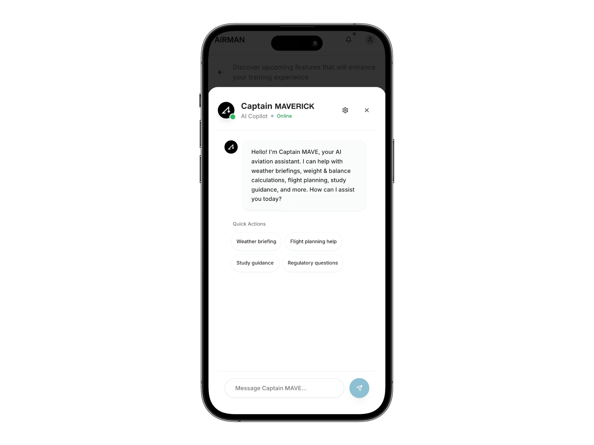 Captain MAVE is your personal AI flight assistant built for planning, briefing, learning, and logging.